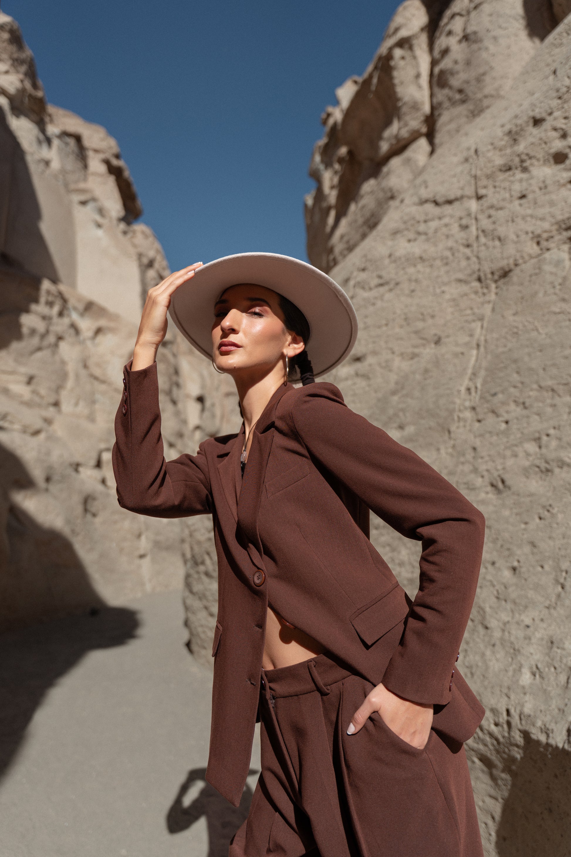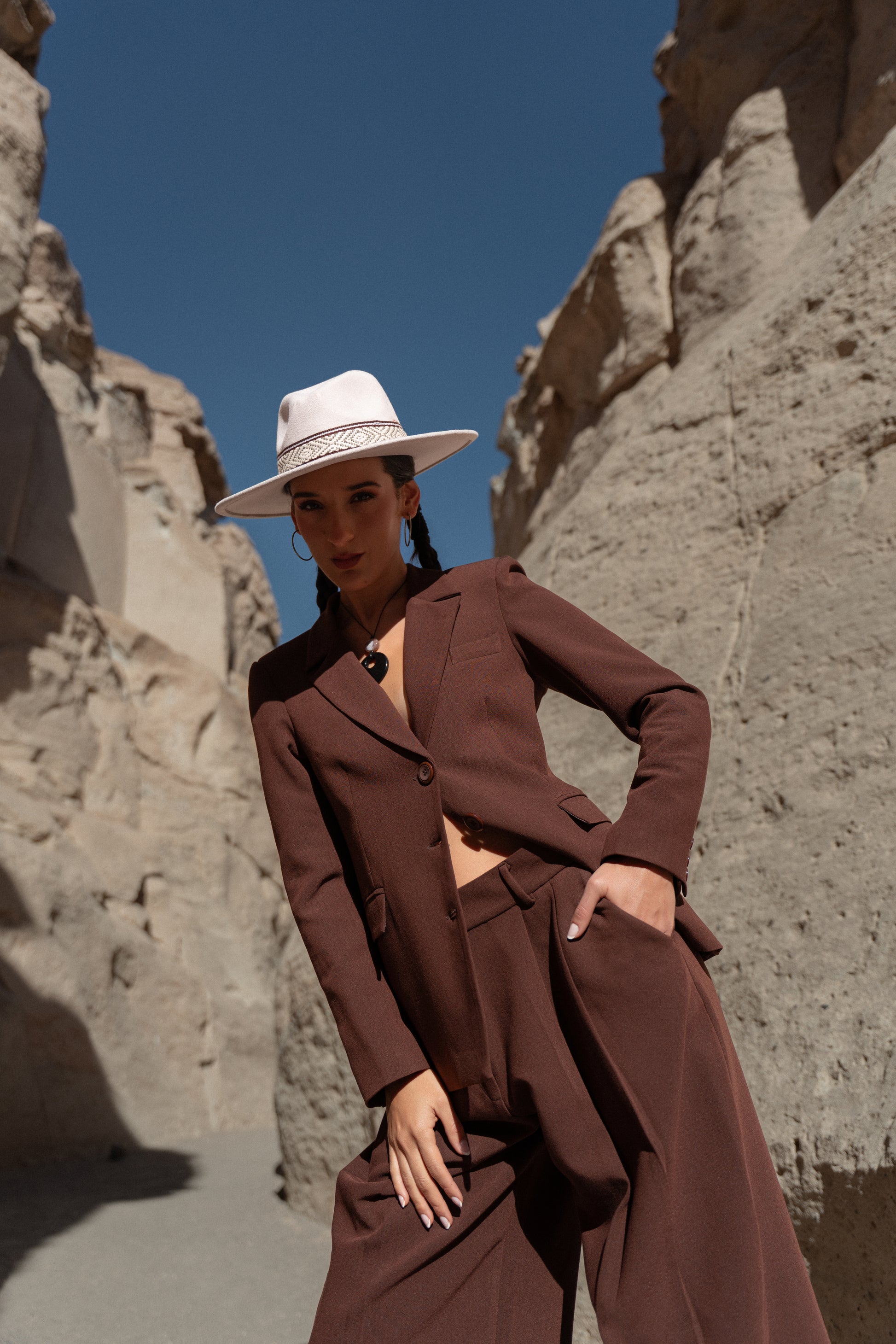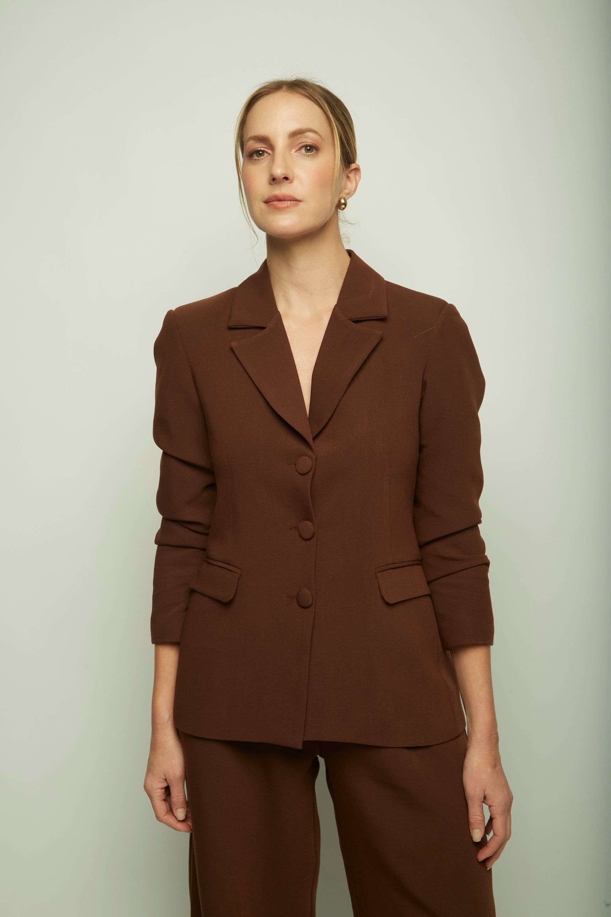 CORTE PRINCESA EN DELANTERO Y ESPALDA, PINZA DELANTERA PARA MEJOR ENTALLE . MANGA SASTRE Y SOTAPA DE BOLSILLO. BOTONES FORRADOS EN PARTE DELANTERA Y MANGAS.
