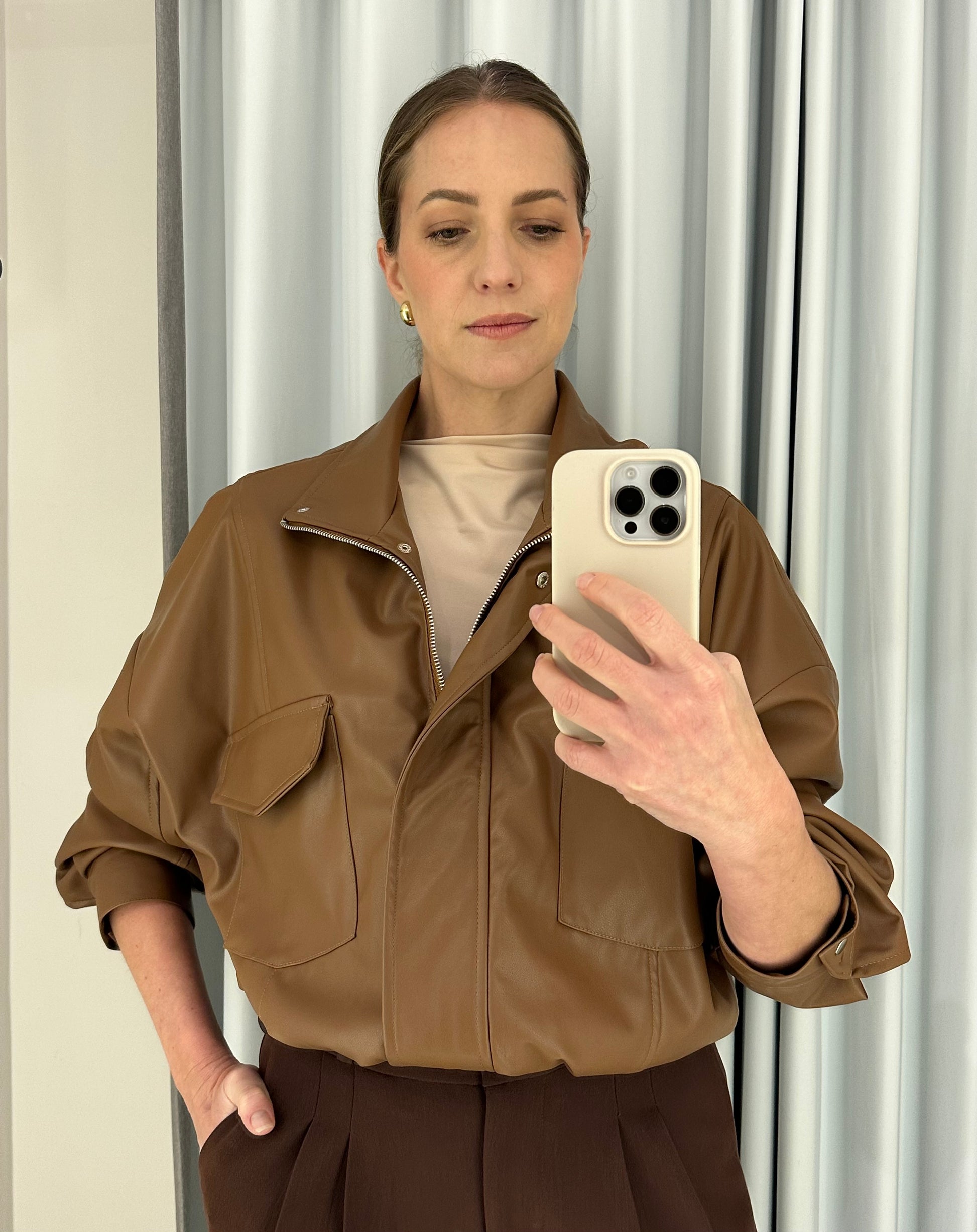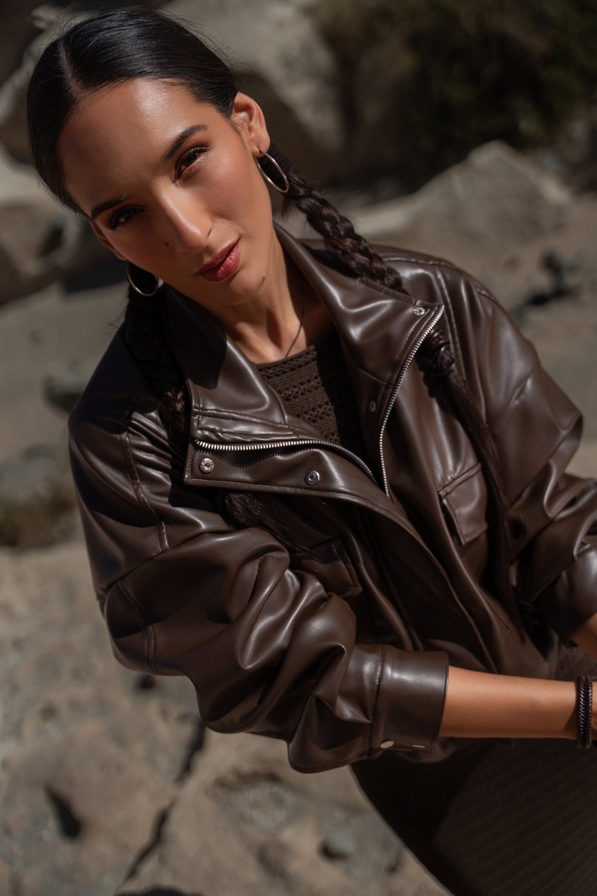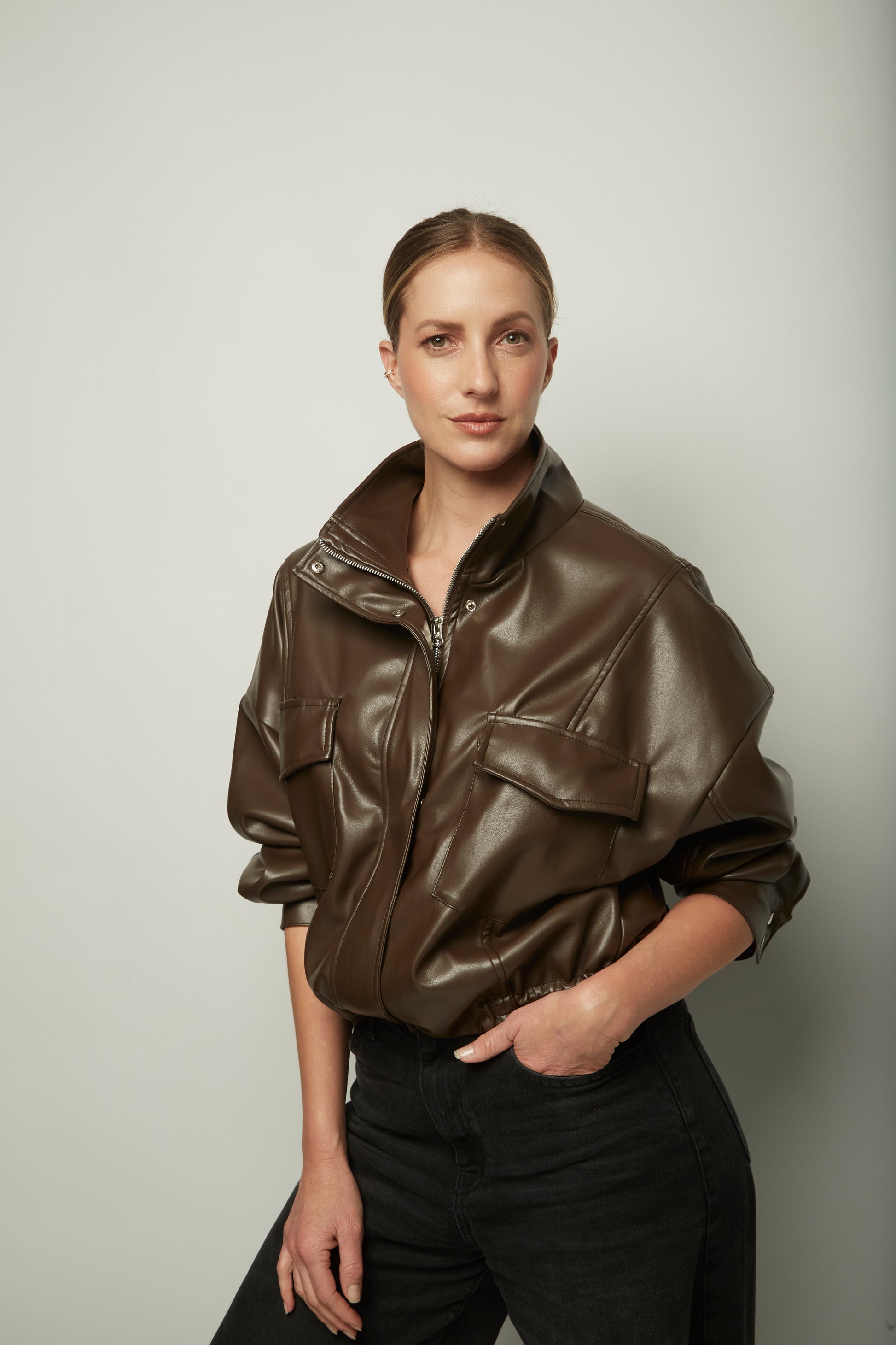 CHAQUETA BOMBER DE CUELLO ALTO Y MANGA LARGA TIPO MURCIELAGO ACABADA EN PUÑO, CON BOLSILLOS PARCHE CON SOLAPA Y ELÁSTICO EN LA BASTA. CIERRE FRONTAL CON CREMALLERA METÁLICA Y SOPATA CON BROCHES.