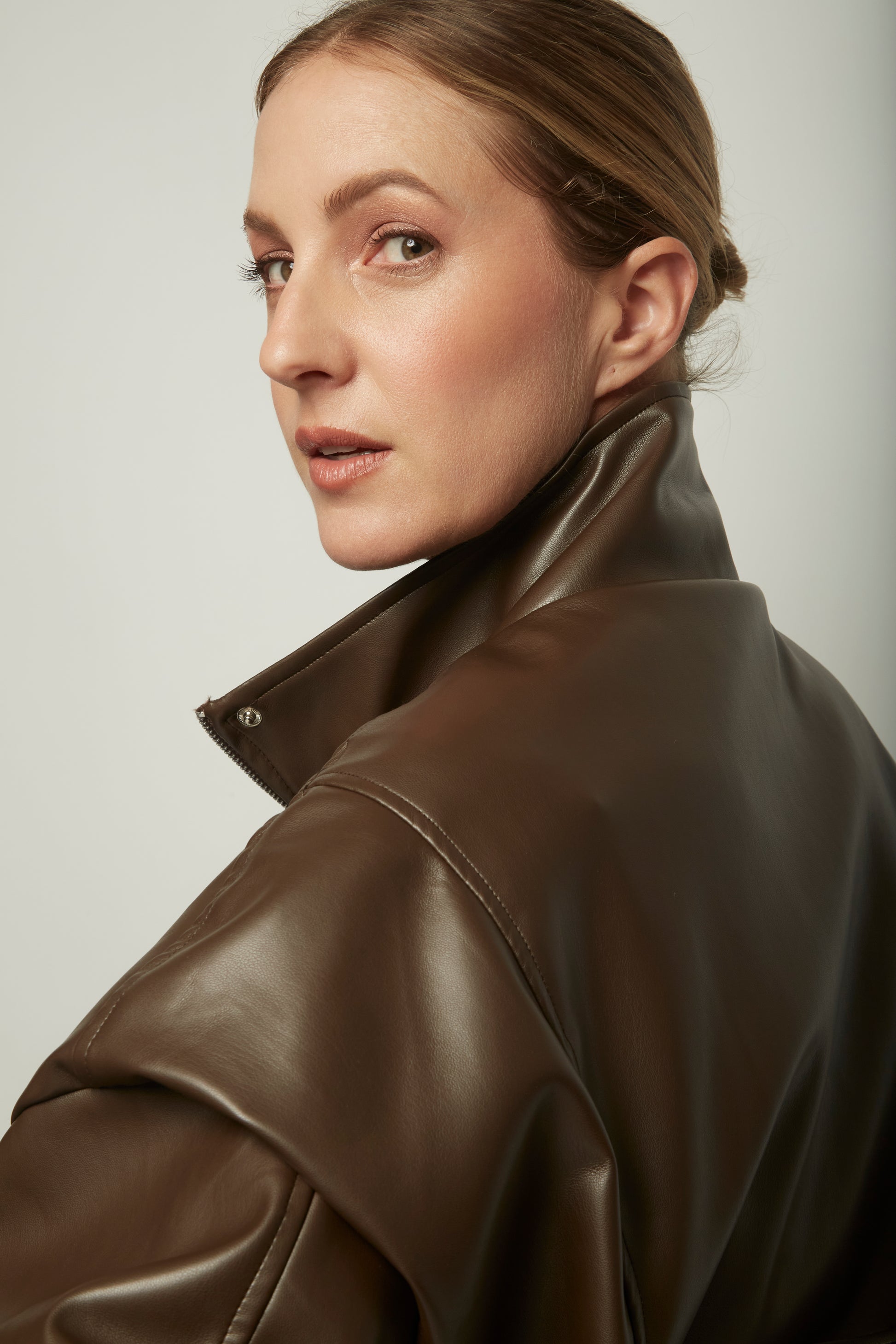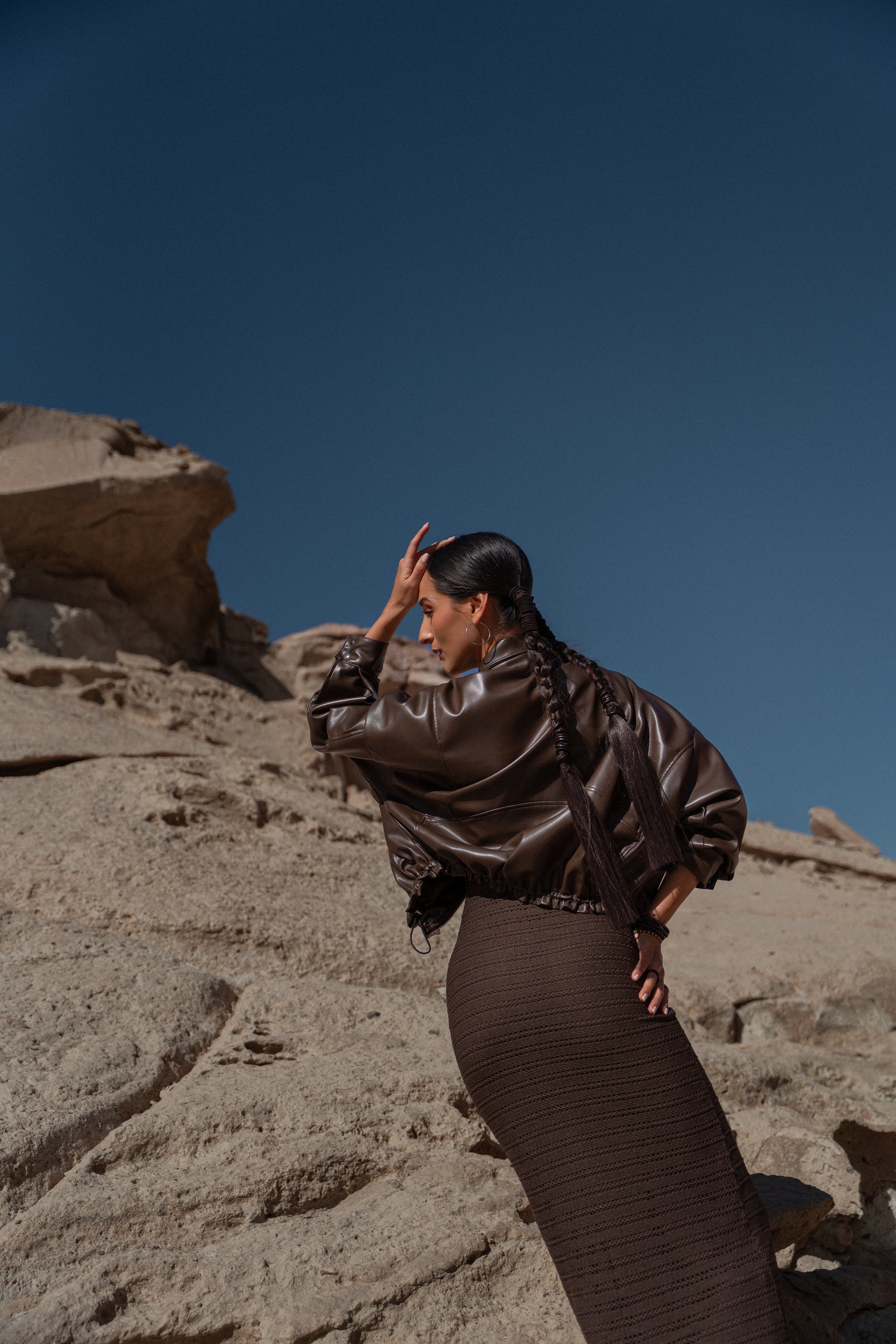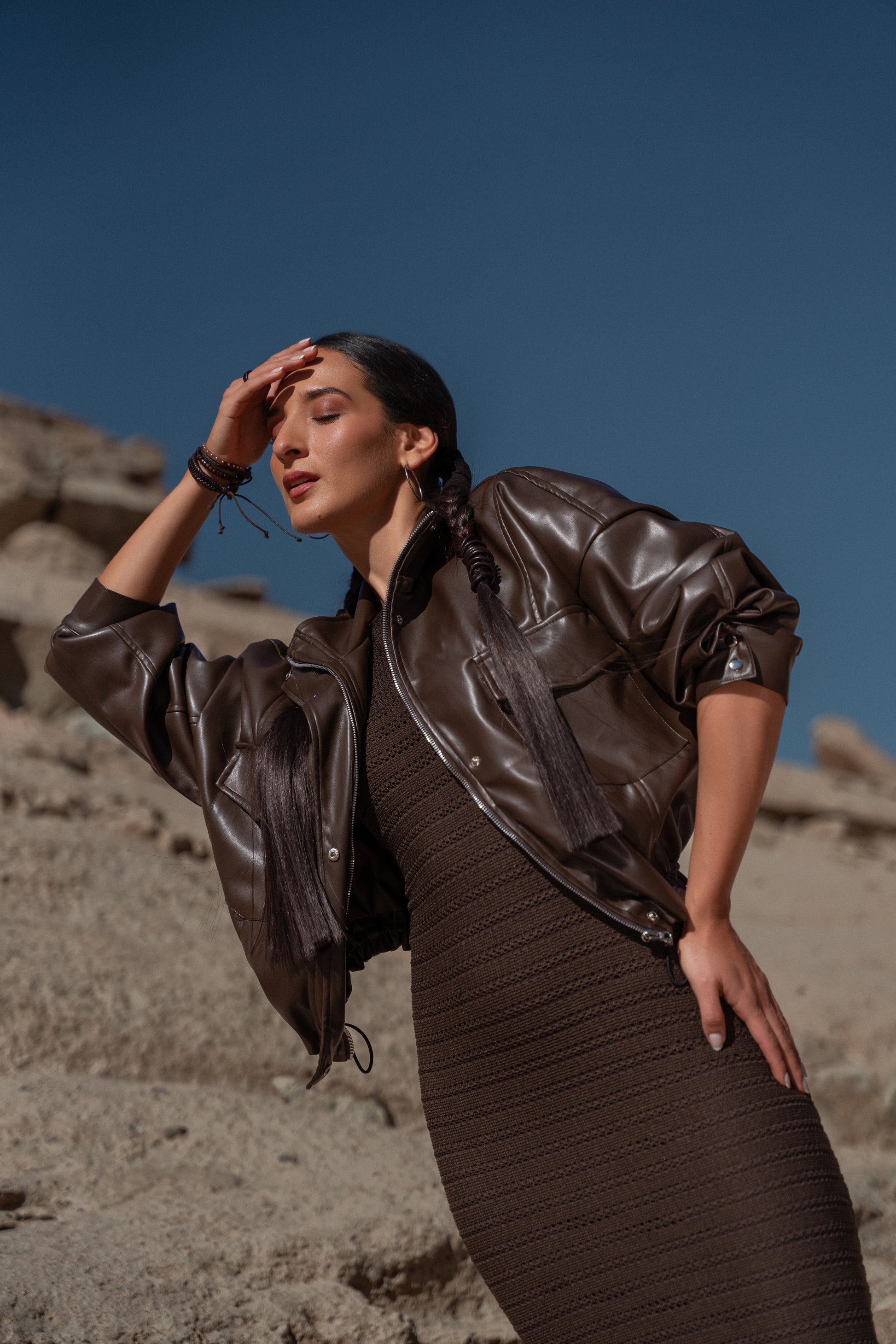 CHAQUETA BOMBER DE CUELLO ALTO Y MANGA LARGA TIPO MURCIELAGO ACABADA EN PUÑO, CON BOLSILLOS PARCHE CON SOLAPA Y ELÁSTICO EN LA BASTA. CIERRE FRONTAL CON CREMALLERA METÁLICA Y SOPATA CON BROCHES.